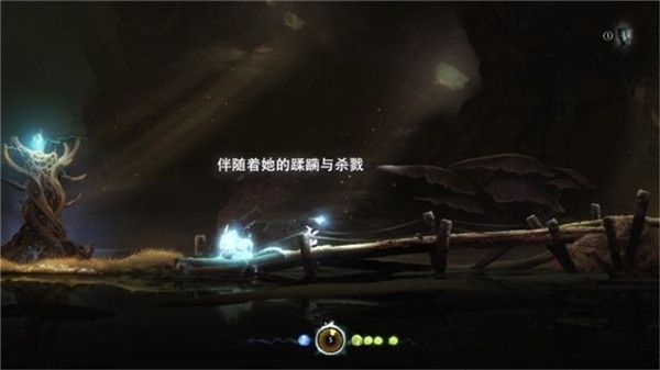 16、到达第四段木桥时,奥日已经安全了,左侧的枯树内有一个能力核心,可以在后期获得践踏技能后,返回到这里在枯树顶部使用践踏轰开树顶内进获得能力核心。