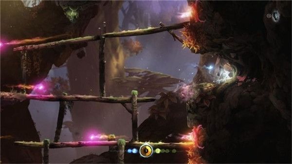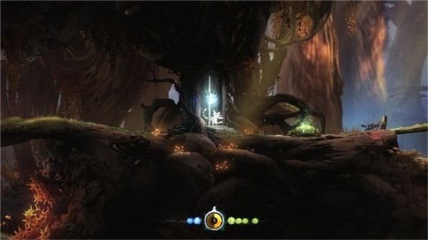 奥日需要以飞檐走壁登上一层木桥,在每一段木桥上奥日都需要用跳跃来躲避飞来的炎弹,最好就是跳到左右两端的石台上暂时缓一缓。