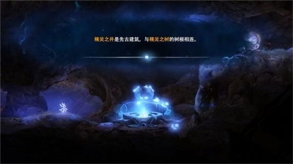 击破弹床右侧的一排尖刺球,奥日会发现到一个能量井(或叫作精灵之井),能量井可以为奥日恢复满所有的能量,使用之后学会的飞檐走壁(后期才能学会)爬上右侧的岩壁可以获得能量核心(2/15)。