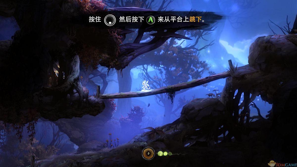 往左侧走去,穿过一个树洞可以发现左侧有一个坑,在坑上方有两个悬吊的树枝,先不上去,因为需要拿到精灵之火才能够继续前进,选择是先跳入卡在坑口的长长树枝上,沿着树枝往左端走去,会发现第一个能力核心。
