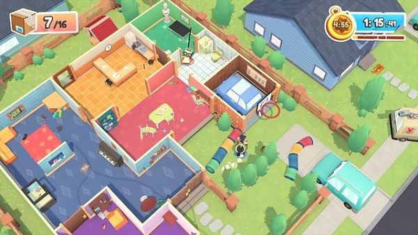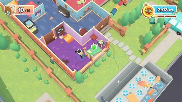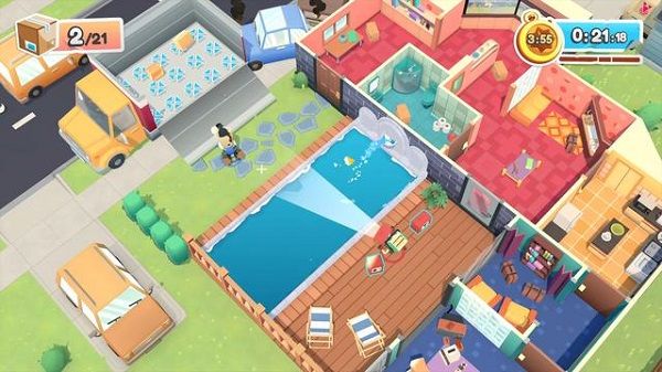 该游戏可提供1-4人同屏进行游戏。大家扮演的搬运工角色需要在规定时间内通过分头行动,或者合作搬运重物的方式,把一个房子、农场、实验室里的规定物品全部装上车。
