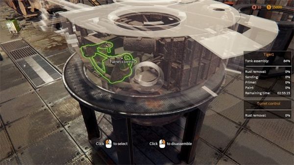 3、好了现在进入游戏,先说下坦克的修理,本游戏只有但不仅仅包括徒手掰钢筋,肉身焊钢板的拆卸,还有打磨抛光就能全部维修完毕的神技,外包维修也是一样打磨喷漆就卖给你了,所以你要做的只有灵活利用E(检视模式)进行除锈抛光底漆。