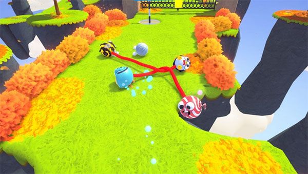 在《终极拉扯》中,两名玩家分别系在可伸缩的弹力绳两端,组队跨过绚丽而混乱的障碍竞速场。