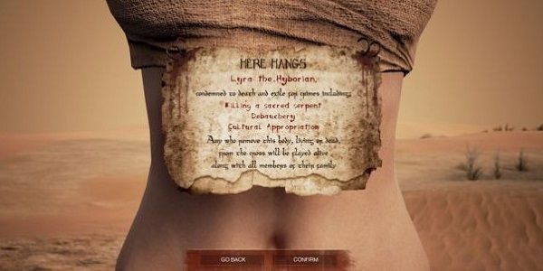 在决定完人物的最终形象之后,你所犯下的罪行就会摆在你的面前。游戏从所有的罪行中选出三条,其中一些非常好玩。完成之后,某个人就会现身,把你从十字架上放下来。然后,你就可以在流放之地中自由地生活、战斗和生存了。