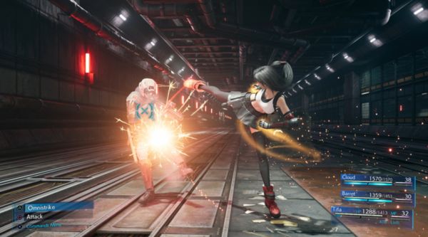 除此之外,在最终幻想7重制版在战斗系统上保留了非常多经典元素,比如ATB量槽、三人小队、晶石魔法、召唤兽等,但这些原本基于回合制的设计如今都被融入到了全新的即时战斗当中,战斗中,你只需按方框键即可连续攻击敌人,并且慢慢积攒ATB量表;按下圆圈即可冻结时间,然后消耗ATB槽来施展技能、释放魔法、使用道具、或者在特殊情况下呼唤召唤兽。这样的设计在确保流畅而快速的战斗节奏之余,最大限度地保留了原版回合制下的策略性和多样性。
