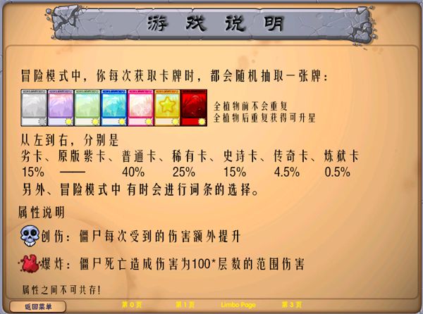游戏功能介绍,在图中游戏说明中介绍了这款游戏抽卡的概率与对僵尸造成伤害的计算