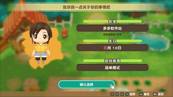3、这里玩家可以为自己的人物填写好名字、生日和游戏难度后选择并点击“确认选择”的按钮选项;