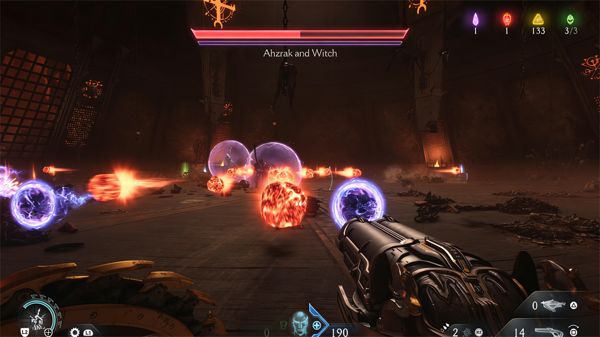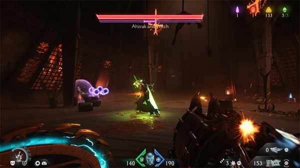 他会使用你过去见过的许多长矛连招,但女巫会同时向你发射能量弹,让你的战斗更加困难。由于它们的散布范围广泛,你可以轻松躲避,所以重点是格挡阿兹拉克的攻击,并用超级霰弹枪或近战反击。