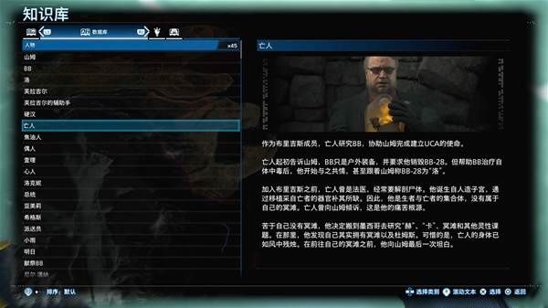 作为布里吉斯成员,亡人研究BB,协助山姆完成建立UCA的使命。