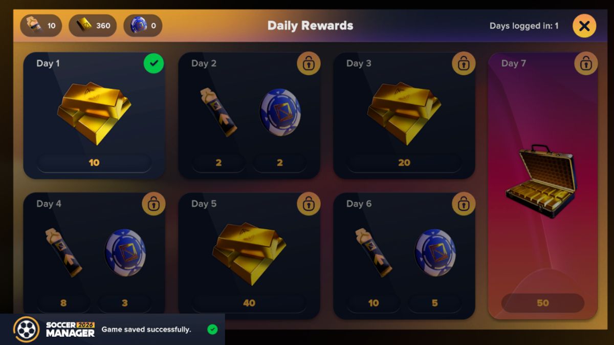 10、持续领取免费资源能让你的发展更轻松。每日奖励提供金币、礼包和增益效果。目标会引导你完成训练或赢得比赛等有用操作,同时提供奖励货币。即使没有时间玩比赛,每天登录也能确保稳步发展。到第7天,你可以收集高价值奖励,显著帮助你的球队。