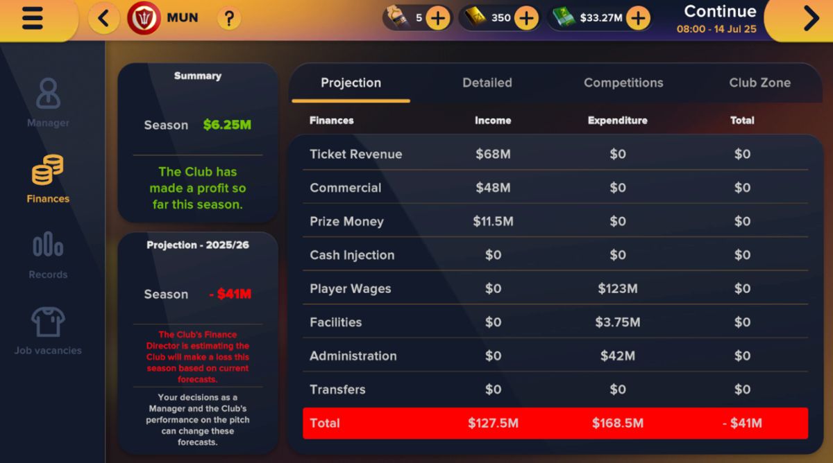 2、财务控制与战术同样重要。工资或转会支出过度会导致亏损,这可能会让董事会不满。财务面板会分解门票收入、商业收入、奖金和支出。始终检查赛季预测——如果显示亏损,你需要调整支出或签下更强的赞助商。在俱乐部区域选择合适的赞助商可以显著提高你的年收入。
