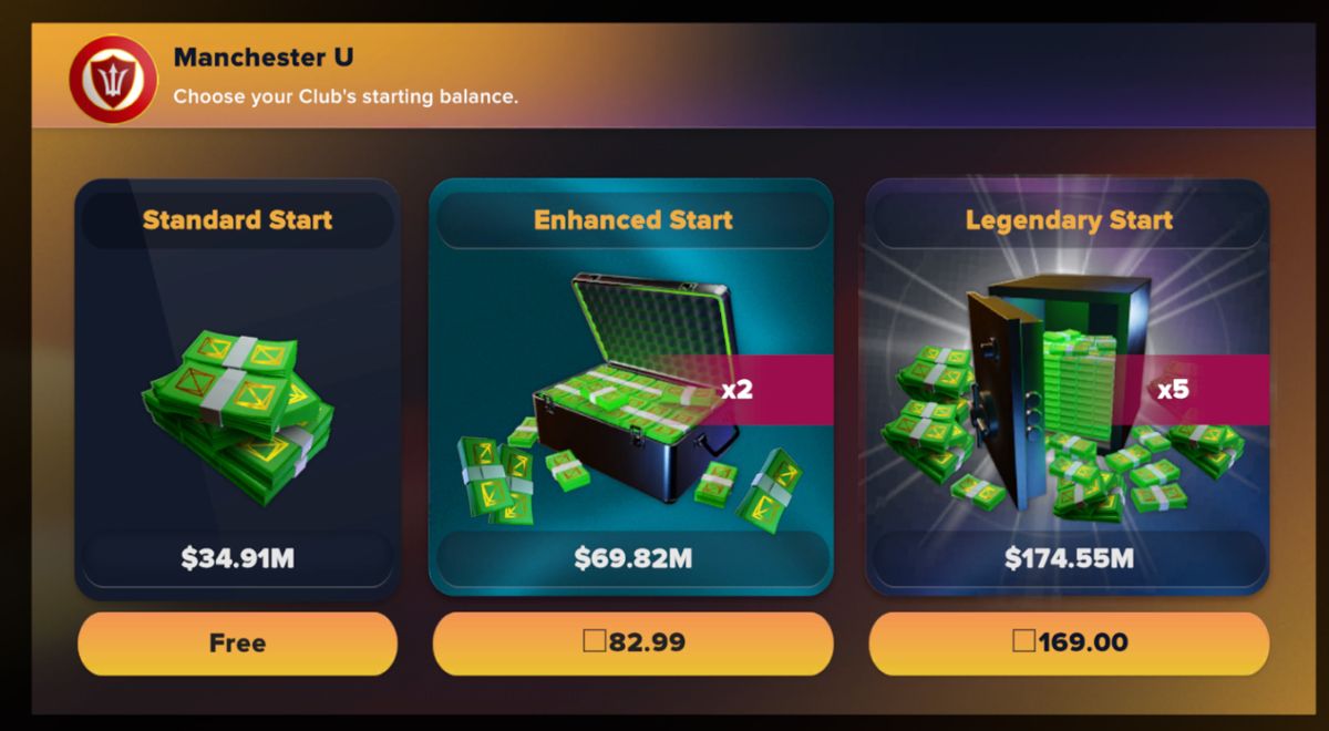 3、在开始管理之前,你需要选择俱乐部的起始资金。标准起始会给你大约3400万美元,迫使你依赖侦察和谨慎的转会。增强和传奇起始会提供巨大的提升,但它们也增加了鲁莽支出的风险。初学者受益于标准起始,因为它能培养纪律性——只购买你的阵容真正需要的。老手可能会享受更大预算带来的自由,以便更快地重建球队。