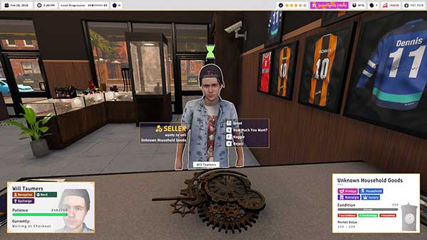 游戏包含完整的典当系统(贷款、利率、赎回)、与技能等级挂钩的物品修复小游戏、基于物理插槽的存储管理,以及根据店铺氛围和购物体验变化的动态声誉系统。