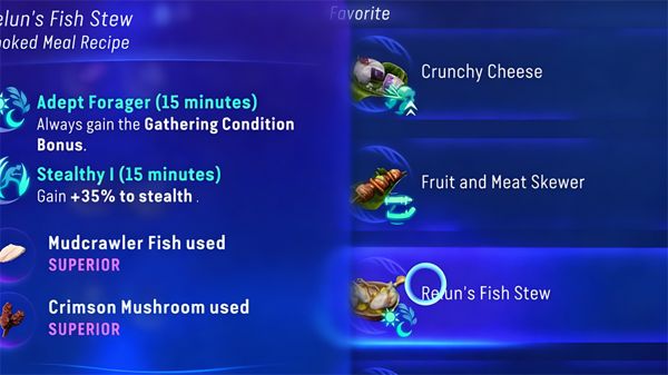 这道菜用泥蚯蚓鱼和猩红蘑菇制成,这两者都是更优质的成分。这样你会获得15分钟的适配器锻造者采集状态加成,并在15分钟内获得35%的潜行加成,所以你应该查看猎人指南,把泥蚯蚓鱼钉住以获得制作所需的材料。