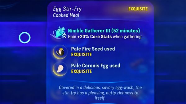 这是采集和收获的最佳食谱之一;配方对于制作采集者至关重要,采集者能让你在采集中获得完美增益,持续30分钟;而敏捷采集则能在采集时额外增加15%的核心属性。这顿饭的两种必需食材是云喷种子和藤蔓蘑菇。