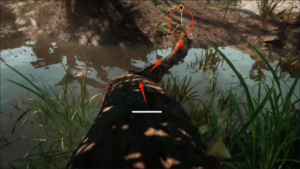 1、先走到黄标的位置,沿着树干跨过湖泊到达对面。