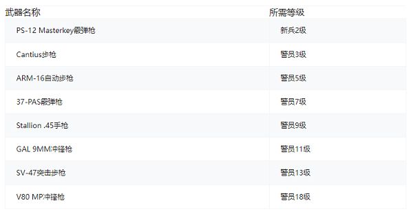 以下是警区The Precinct中所有可解锁武器的完整列表以及解锁所需的等级: