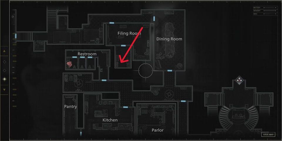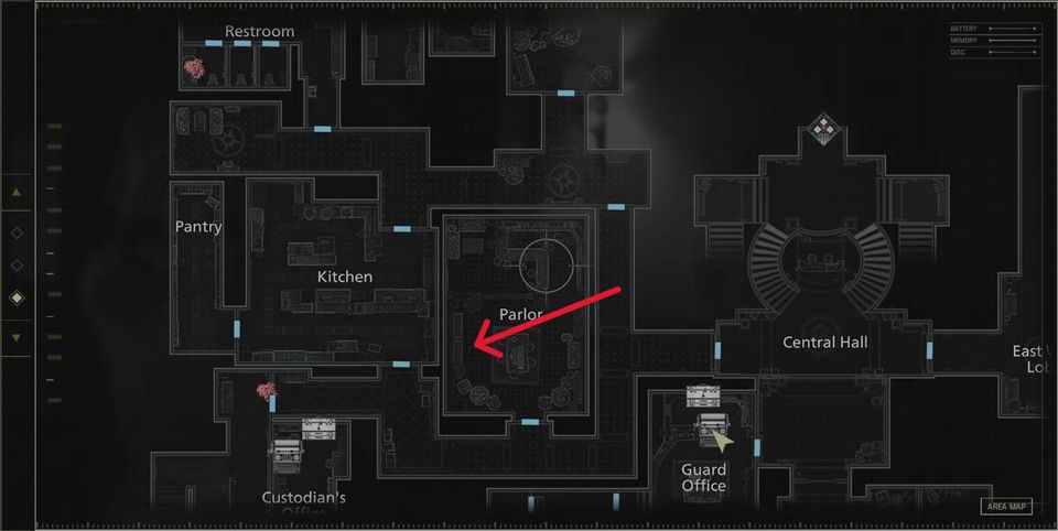 4、小厨房:获得身份证手环(1级)后,用它打开一楼客厅外的铁栏门。沿着清洁工办公室对面的楼梯上去,进入办公室。从那里向北走,你会在水槽旁的厨房里找到雕像。