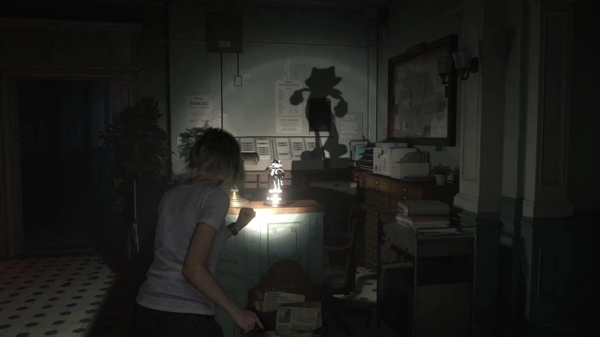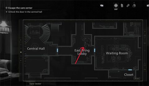 2、东翼大堂:一旦你进入东翼大厅,就来这里,看看角落里的接待柜台。浣熊先生的雕像会放在柜台上,靠近小灯。