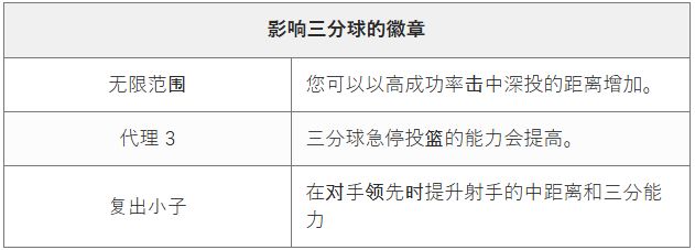 拥有大量投篮徽章的玩家,投篮成功率更高。其中,拥有多个适合远距离投篮的徽章的选手,更容易投篮得分。