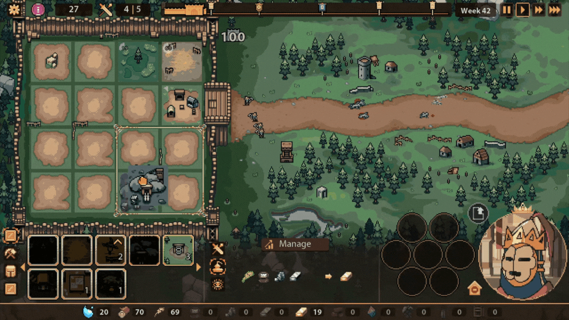 初始只有免费的水井可以建造,其它的资源建筑需要通过各种资源以及后续的战斗才能逐步解锁。因此,在游戏的开始就要规划自己的建筑区域,以便在国王的监视区域内可以同时生产当前所需的所有生产资料。当然,所有的建筑区域也可以通过手动调整的方式改变它们的位置。不过在区域迁徙后,地块的人民会表达不满,它会在一定时间内极大的降低该建筑的生产效率,你也只能通过时间来抚慰这些规划不利带来的发展阵痛。