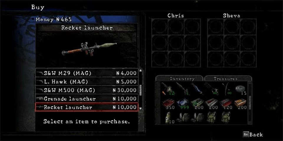《生化危机》系列包含了一些具有挑战性的Boss。不过,许多敌人对火箭发射器有弱点。《生化危机5》中的角色也不例外;火箭筒可以一枪击杀大多数敌人。