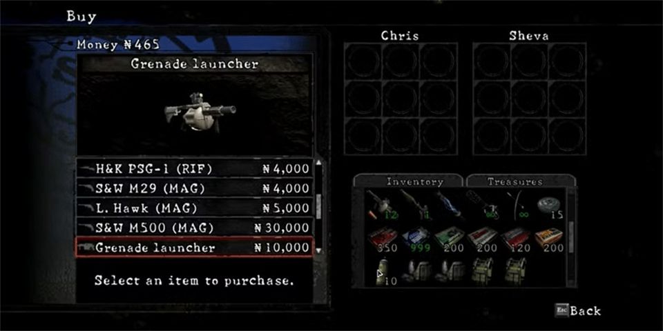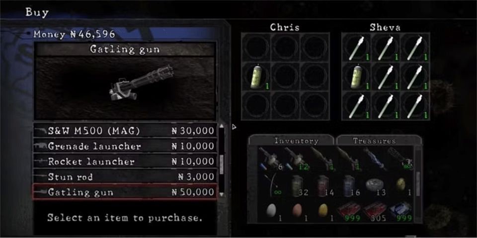 更重要的是,与游戏中其他武器不同,你实际上可以购买枪 械的弹药。当你接近Boss或故事中困难的部分时,这会非常有用。如果你错过了第四章的发射器,可以用10,000金币买一个。