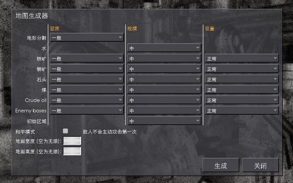 5:敌人的规模不建议选无,因为有科技是需要杀怪才能研究的!如果想大搞建设,选中和平模式就好,只要你不攻击,敌人也不会攻击你,炮台除外!