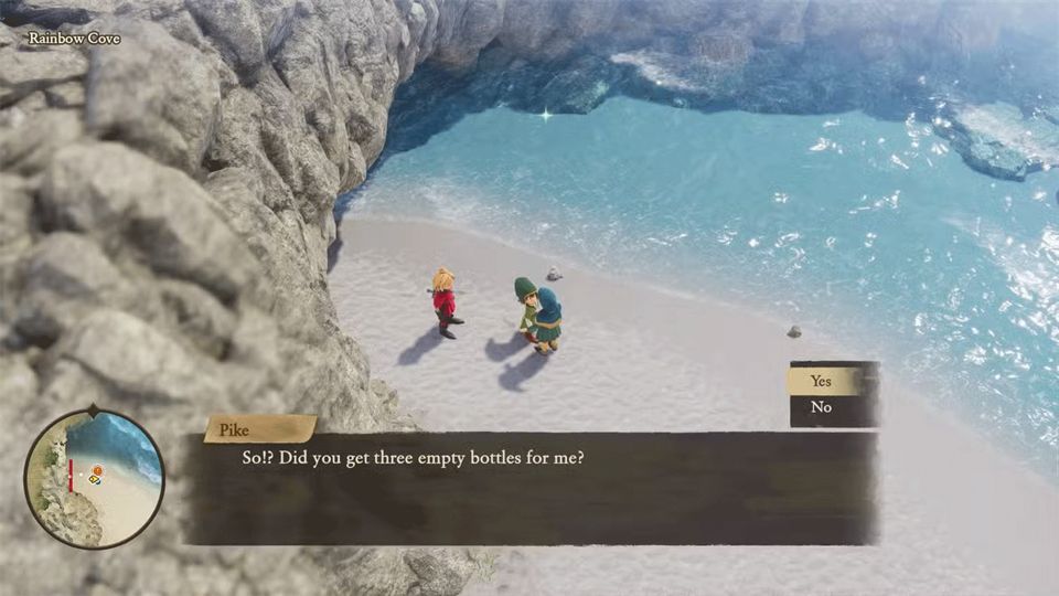 他们唯一需要做的就是用彩虹湾闪闪发光的水装满那些瓶子。去海岸线与那里互动,装满水,然后交还给派克完成请求。