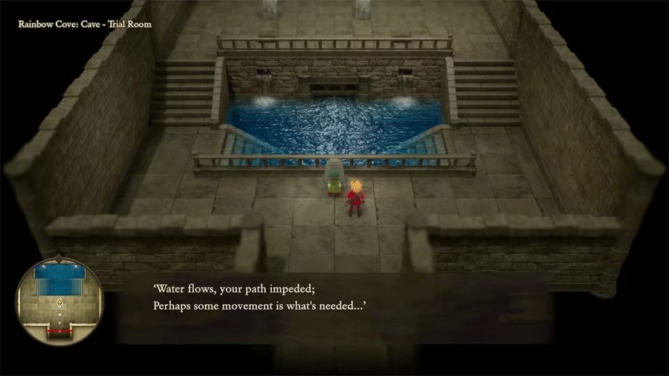 收集完瓶子后,玩家需要在彩虹湾与他会面,他会揭示通往另一个谜题房间的通道。解法很简单:只需推开岩石阻挡水流,就能露出通往石碑碎片的门。