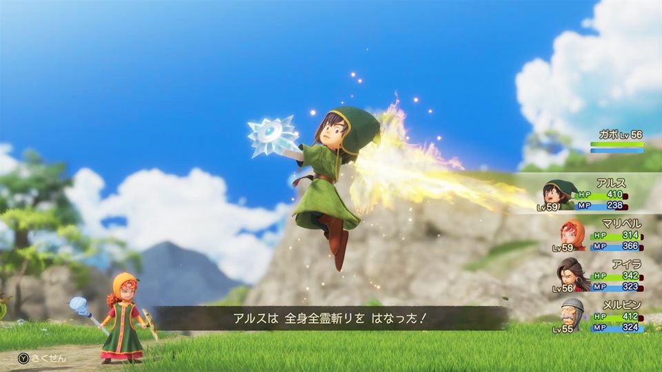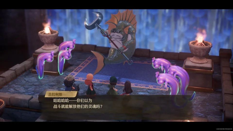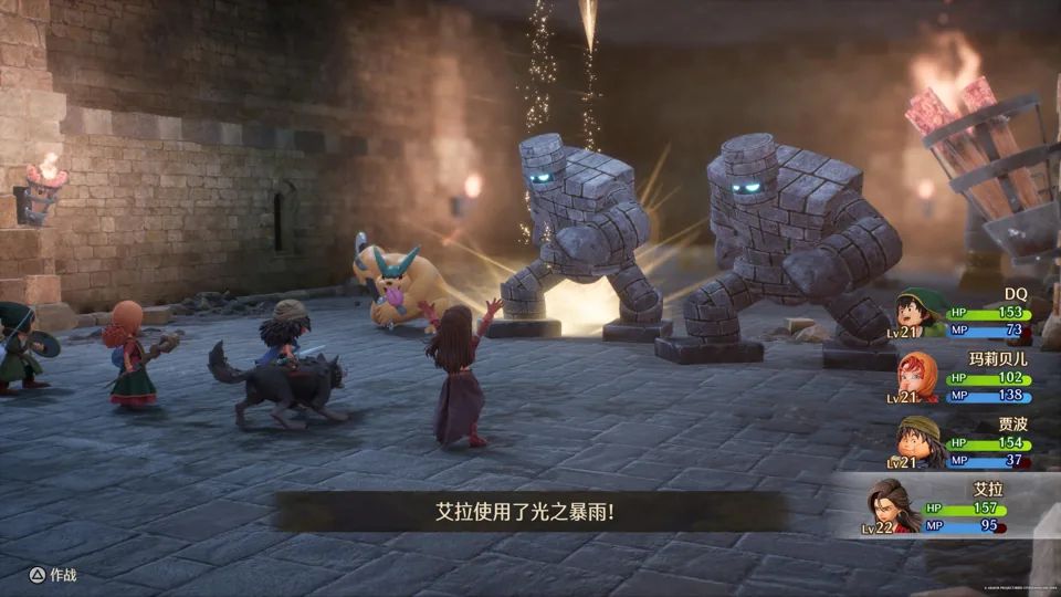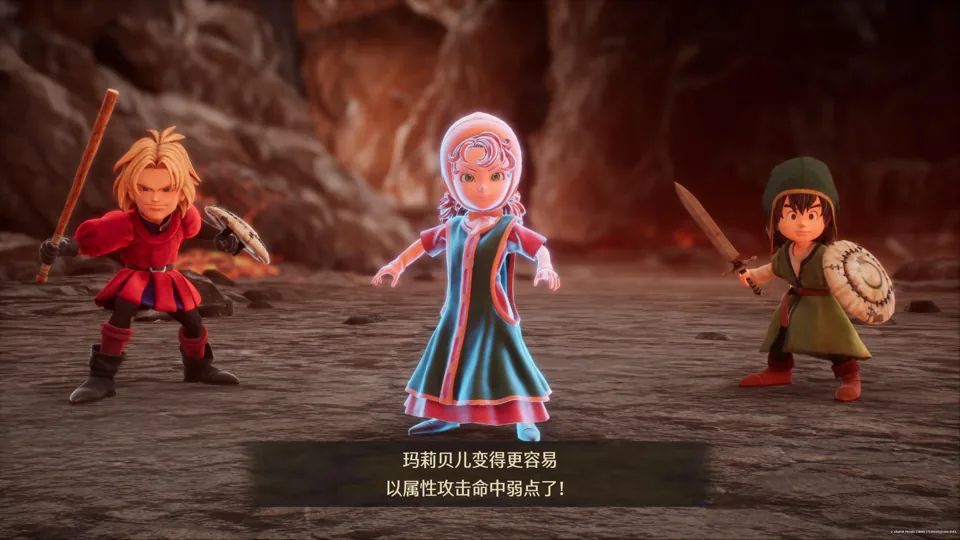 本作的部分演出动画提供了配音。而在山洞等迷宫场景中,若使用 DQ7 经典的“呼叫队友”功能,队友的对话会有在迷宫墙壁间回荡的混响效果,临场感十足。