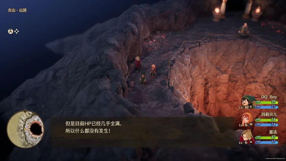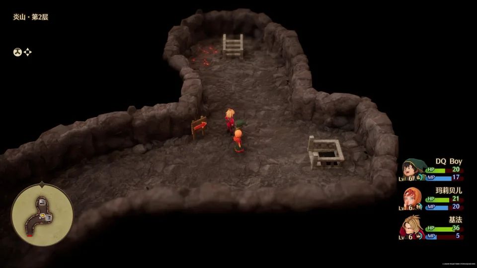 炎山与深山塔属于典型的 DQ 风格迷宫,玩家需要在几个楼层间的楼梯反复穿梭,寻找通往隐藏宝箱的通路。值得一提的是,炎山迷宫中,游戏会在地面上给出融入场景的方向指引,既不破坏游玩沉浸感,又能提供有效的引导。
