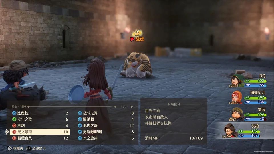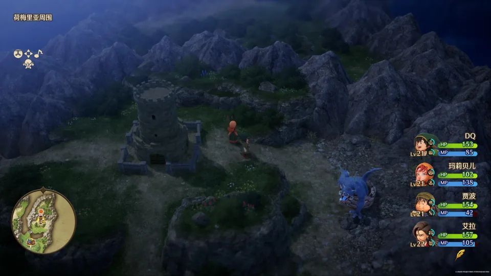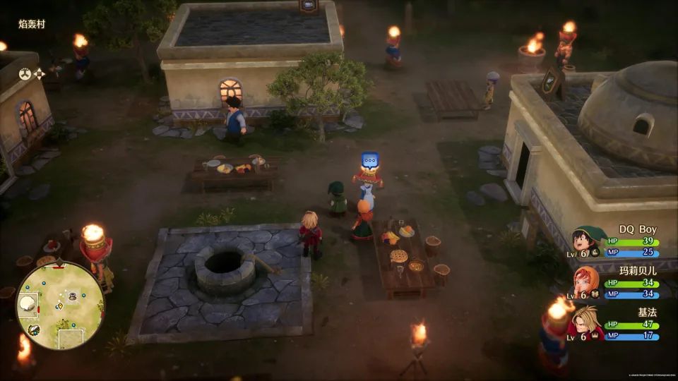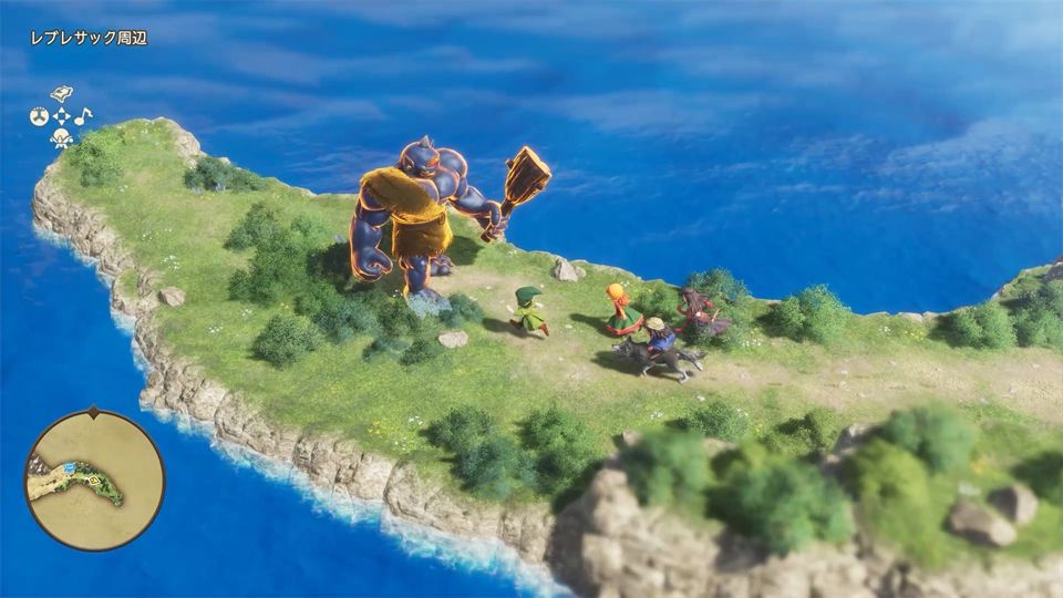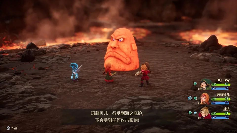 在操作方面,《DQ 7 RE》为方向键赋予了更多功能。在我们体验的版本中,按下方向键左可以利用魔法或道具自动回血;按下方向键右则是通过吹口哨直接将周围的明雷敌人引诱过来开战,省去了跑到敌人身边开打的繁琐。