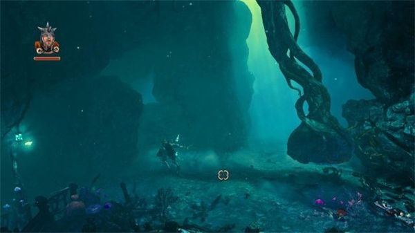 6、进入到幽暗的山洞内,去到右侧发现地板有一道大木门,跳高后同时 按着鼠标左键和鼠标右键使用庞提乌斯的下坠践踏攻击打破。