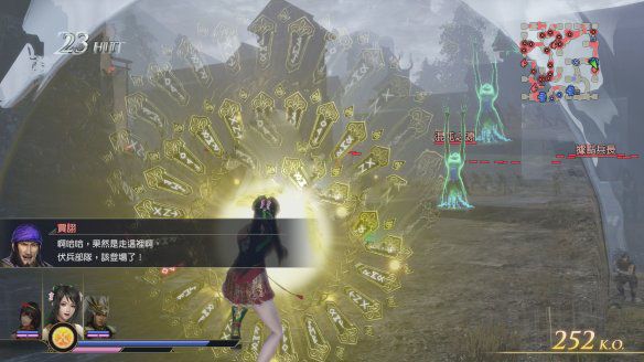 C5:转一圈攻击周围一圈(使用时会出现一个八卦阵的特效),带属性,被打中的人脚下会长出竹子产生攻击判定,八卦阵特效出现后,用影技或者神术取消后,竹子依旧会出现。本身伤害一般,但如果敌将在杂兵堆中,会受到复数竹子的攻击判定,伤害会变得很高,是一个人越多越强的招式。另外,这招在人堆中使用时攒合体槽速度非常快(但因为普方管不到身后,人越多也意味着被打断的可能性更高,对出手时的位置需要一定的把握,对走位有点要求,需要尽量保持身后没人)。