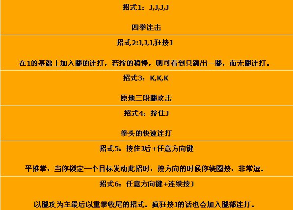 12.任意方向键+K+J+K(可不按)+K(可不按)+J(按住J不放就是佛山无影脚。。。)