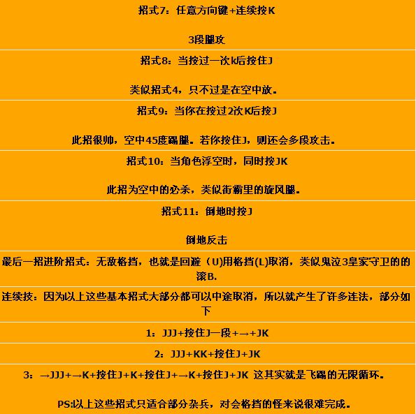 8,任意方向键+K+J+按住J不放(只限于J没攻击中敌人才出第三招)
