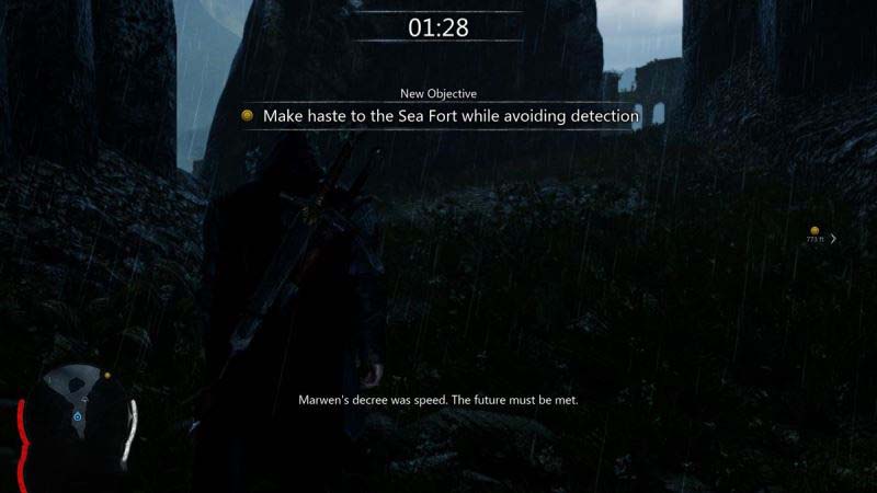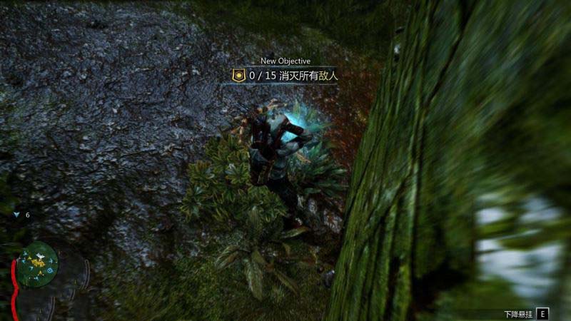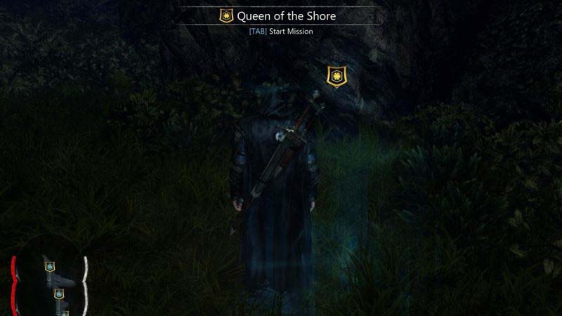 游戏中的潜行部分非常像《刺客信条》,在场景中有很多的树丛,主角可以方便的躲在里面而不被附近的兽人发现。当敌人落单时,玩家还可以引诱(G)兽人靠近树丛,然后一匕击杀。这和《刺客信条》埋伏在干草堆里偷袭的情形如出一辙。