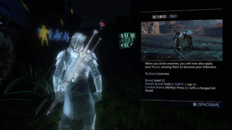 <刻印>按E可以对一个敌人进行刻印,使其变成己方队友攻击敌人,按I键可以使其攻击敌人。(神技不解释,配合隐秘吸取可以偷偷的刻印敌人)