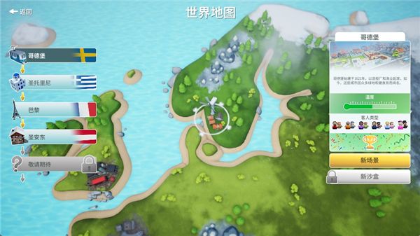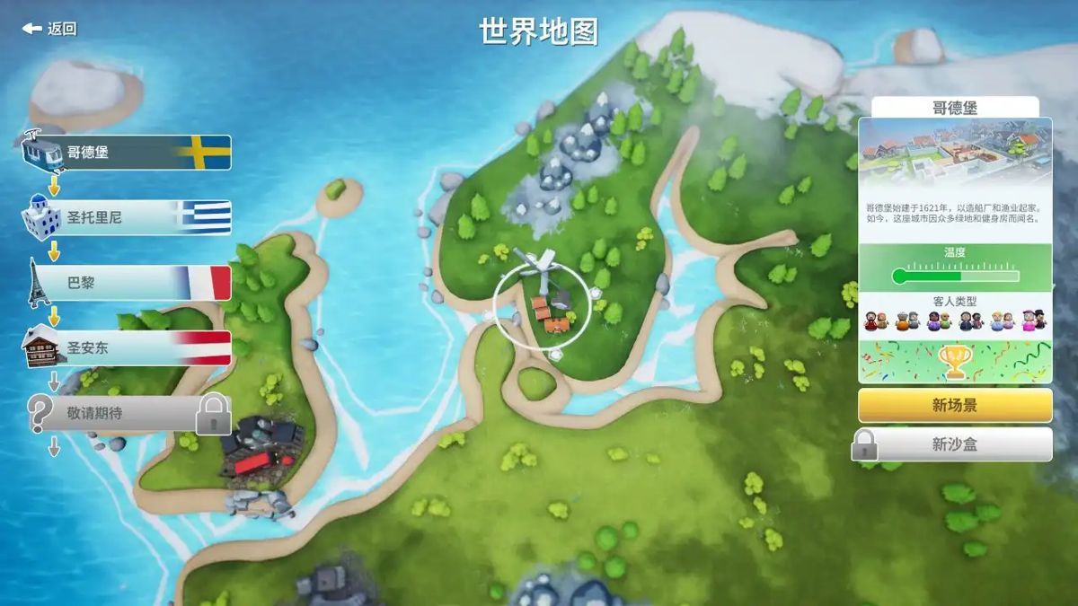 目前游戏有四个酒店地图可供游玩,体验文艺港城的哥德堡、蓝白童话的圣托里尼、艺术之都的巴黎、滑雪天堂的圣安东。玩家可以在不同国家开酒店,每个地方都有独特的风格和气候,只有把前一个地方的酒店打理好,才能解锁下一个新城市,像是在全球开连锁一样,成就感满满。