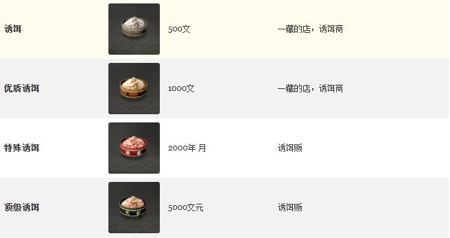 诱饵用于吸引鱼类到你的位置。当鱼已经存在时,这其实并不能帮你抓到鱼。不过,如果你想钓一些稀有的鱼,使用诱饵绝对更好。诱饵有四种类型:诱饵、优质诱饵、特殊诱饵和顶级诱饵。正如你所想,诱饵越贵,吸引的鱼越多。