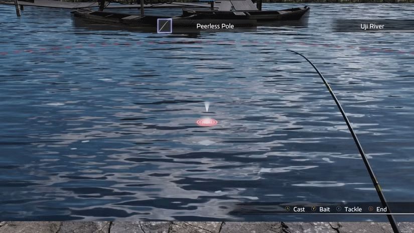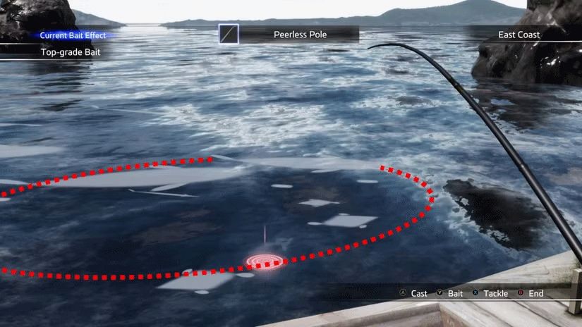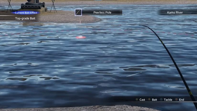 钓鱼的实际操作简单得不得了。一旦你吸引到鱼,让它们啃咬直到手柄震动,然后按下动作键把它们拉进来。或者,如果你不想依赖震动,也可以观察鱼饵上的红色标记。一旦那个红色标记落水,就把鱼拉上去。当然,真正难点在于如何吸引合适的鱼的注意。