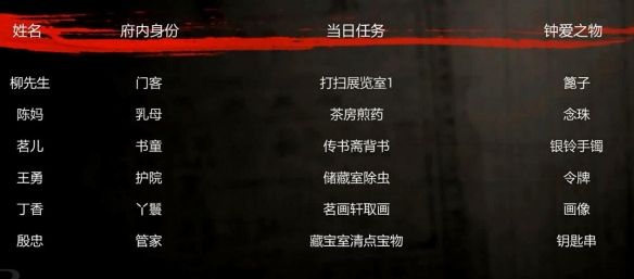 6、柳先生在府内是一名门客,任务是打扫展览室1,钟爱之物是梳子。
