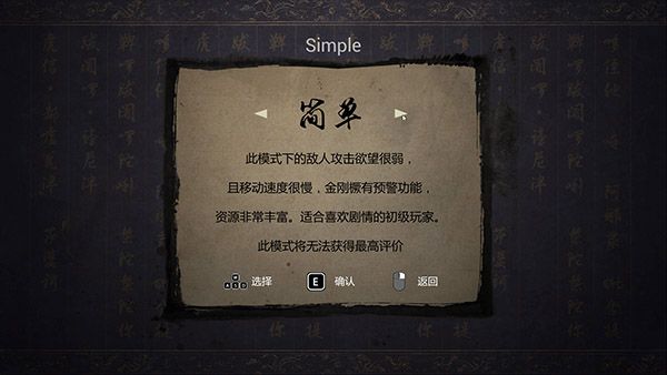 本作设定了四个难度模式,其中简单、普通、困难三个模式在游戏开始可以选择,还有一个隐藏模式噩梦级别,需要通关一次后才可以解锁,并且喜欢挑战的小伙伴可以反复尝试噩梦难度的“金魁”级评价。