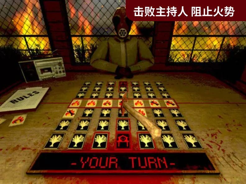 玩家被困于燃烧的瞭望塔中,一场与神秘面具男的生死卡牌博弈就此展开。森林大火随每一次翻牌不断蔓延,双方需守护各自的塔楼卡牌,一旦塔楼被翻开即宣告失败,最终仅有一人能逃离火海,或陷入继承面具的宿命循环。游戏以“死亡赌 博”为核心设定,阴森氛围与未知结局强化了心理压迫感。