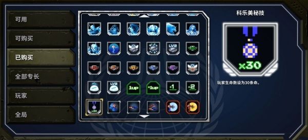 在进入游戏界面,出现经典的大C开头前按上上下下左右左右BA就能获得30命的专长商店能力。