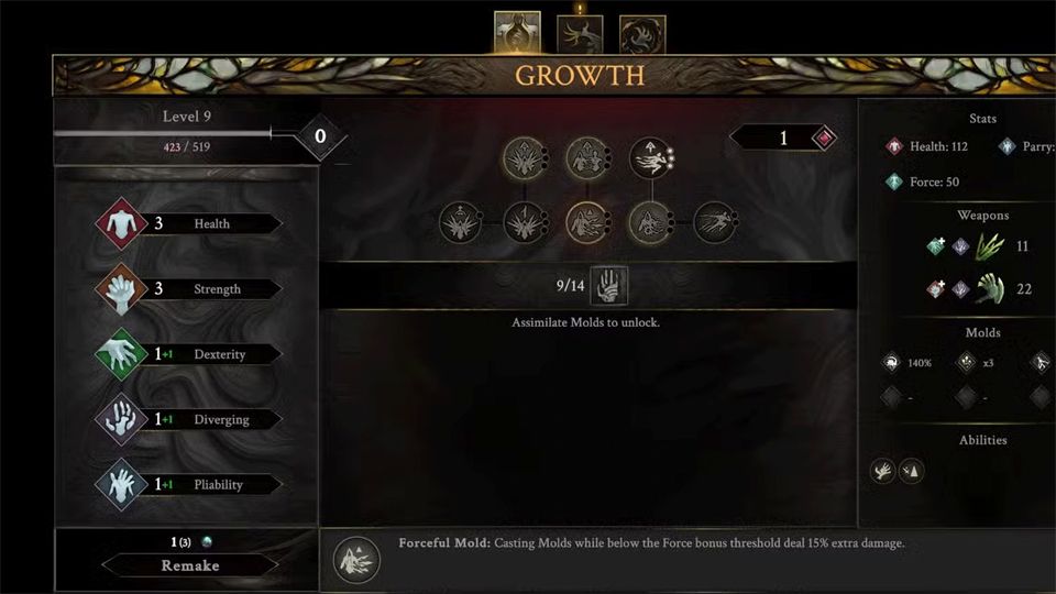 接下来是Foce Mold。每当玩家使用消耗颜料的Mold(不包含物品模具)时,它会恢复20点原力,产生补给效果,保持资源获得稳定,随着玩家与Boss或大量敌人战斗。只需一级Force Mold就足够了。