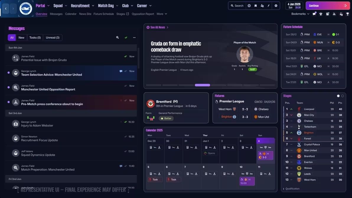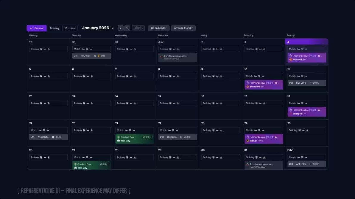 经理中心不仅仅是信息中心,它是通往整个足球世界的枢纽:比赛结果、新闻、赛程、日历等一切触手可及,也是你在 《FM26》 中导航的核心。