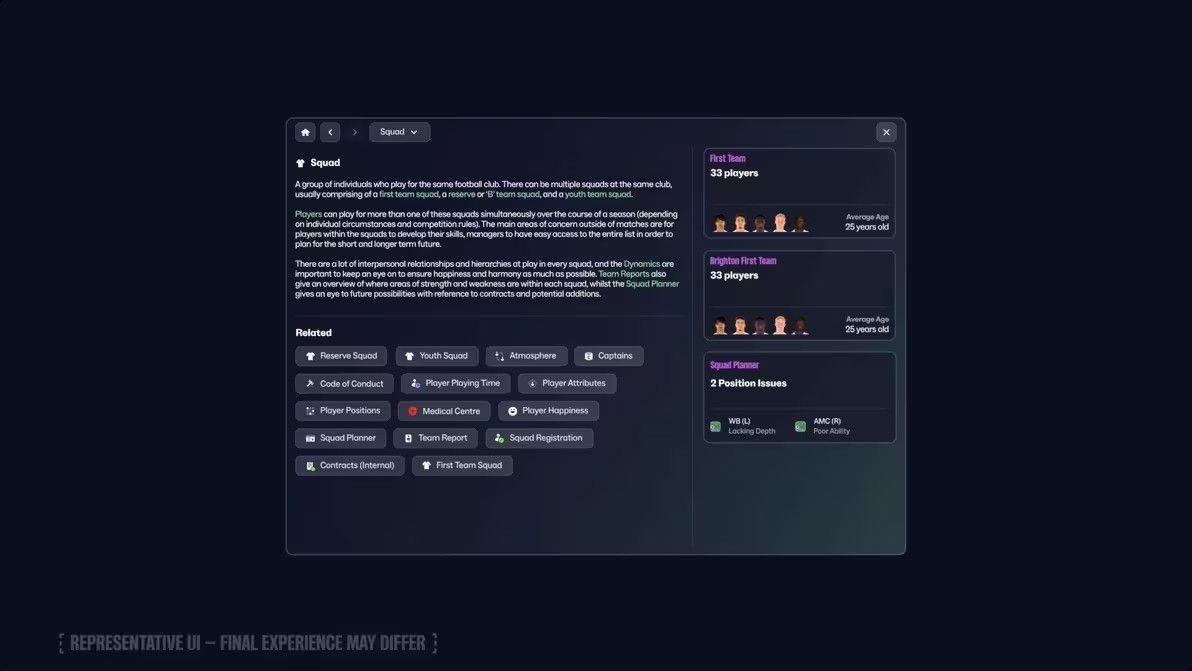 设计团队希望创造一种探索感,让玩家逐步揭示《足球经理》的深度与细节。