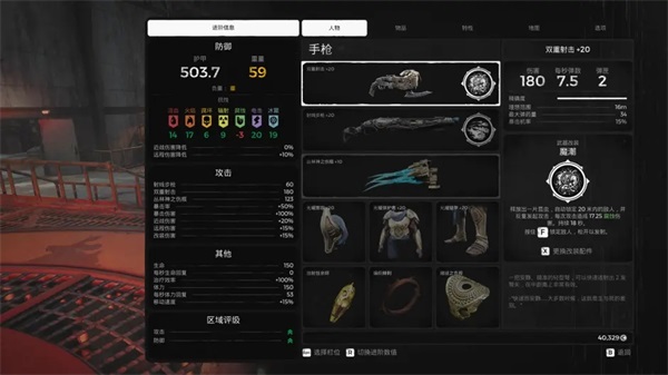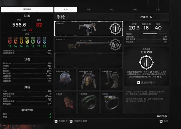 副武器随便带【改装带魔潮就好】项链没有放射性余烬可以换成医疗神符,戒指可以赌徒换猎人【根据boss来决定】,这套伤害主要是魔潮的腐蚀能力加上射线步枪的沙漠气息的伤害,而且优先叠满自身光耀的buff,伤害满分。